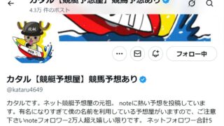 自称プロ予想家 【自称プロ予想屋】カタル【競艇予想屋】の評判は?特徴や口コミ、法的リスクまで徹底解説【2026年最新】 「カタル【競艇予想屋】」の直近1ヶ月のユーザー評価は、非常に厳しい意見が支配的です。的中実績の捏造や「後出し報告」を疑う声が絶えず、有料情報の回収率の低さを指摘するユーザーが相次いでいます。また、不都合な指摘を行うと即座にブロックされるとい>口コミ・検証・星評価をみる 2026.01.17 2026.01.18 自称プロ予想家