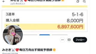 【競艇予想屋パッキャオ@my6KFHPobWlIaus】(自称プロ予想家)ここ1カ月の評判について、直近のSNSや検証サイトでの動向をまとめると、「万舟券(10万超え)の報告が相次ぐ一方で、不的中時の連敗による資金減少を懸念する声」が二極化...「口コミと星評価をみる」