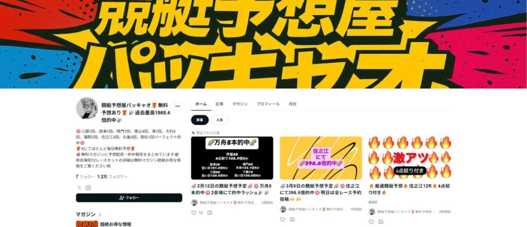 【競艇予想家パッキャオ】は、X(旧Twitter)やnoteを中心に活動する競艇予想家です。圧倒的なフォロワー数を誇り、自らを「プロ予想家」と称して日々多くのレース予想を展開しています。その名の通り、ボクシングのパッキャオのような「鋭い踏み込み」と「爆発力のある展開予想」を武器に、競艇ファンの間で高い知名度を得ています。